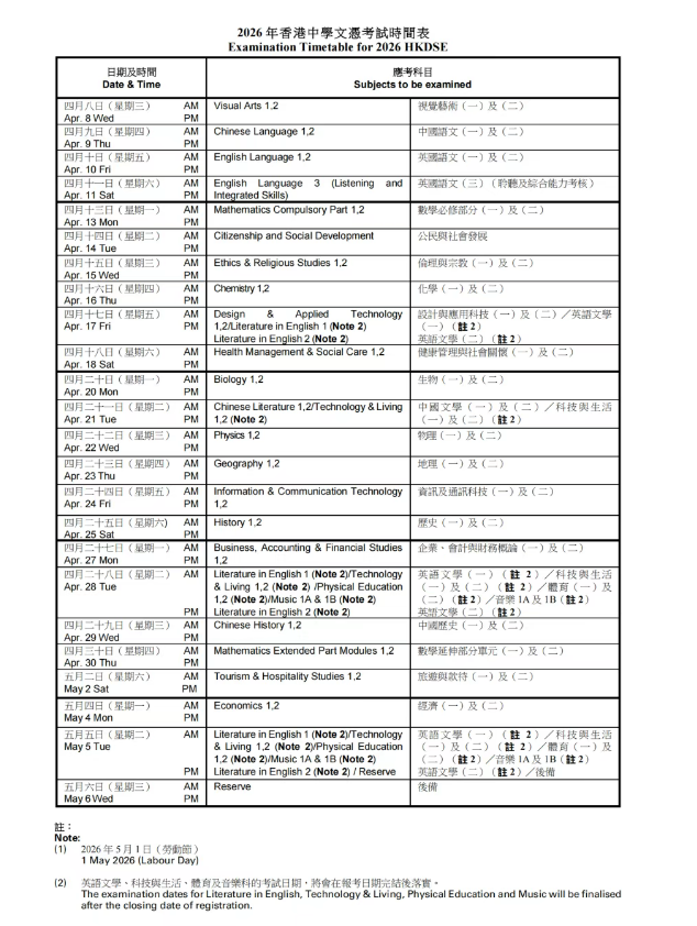 2026年DSE笔试科目将于4月至5月集中进行,实习类考试(如体育、音乐)提前至2月启动。