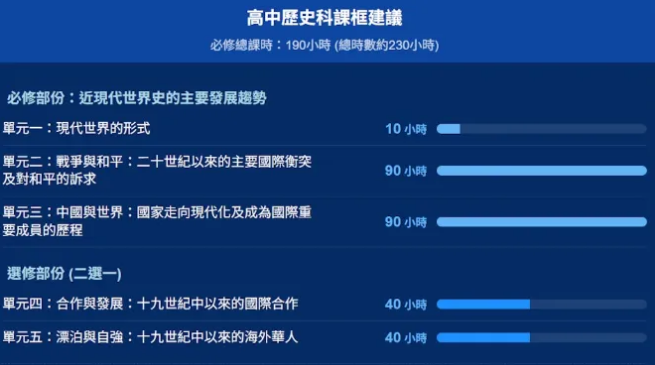 具体看来,香港史的相关内容将正式并入「中国与世界」单元进行讨论。而日本史的部分,将不再侧重于认识日本在二十世纪初的现代化、政治、社会、经济、文化的概况,主要保留有关日本侵华史与抗日战争,并结合在中国单元,而军国主义发展则分散至二战的课题中。