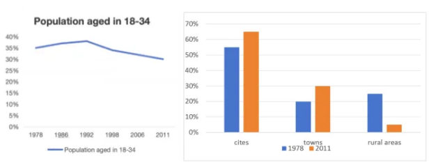 The line graph illustrates the proportion of the population aged 18 to 34 in a certain country from 1978 to 2011, and the bar chart compares the geographical distribution of this age group across urban, town, and rural areas in 1978 and 2011.