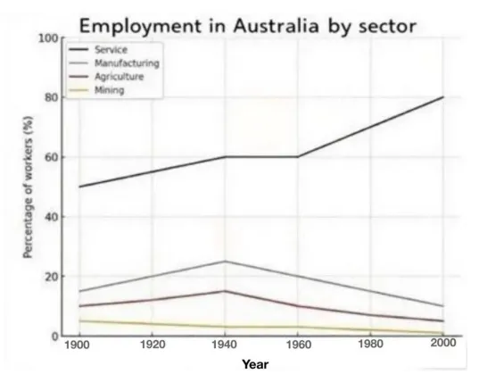The line graph illustrates changes in the percentage of people working in four sectors(service, manufacturing, agriculture, and mining) during the period from 1900 to 2000.