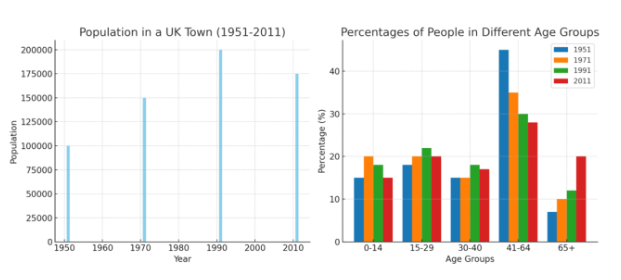 The two bar charts illustrate the changes in the overall population of a UK town and the proportion of people in different age groups from 1951 to 2011.