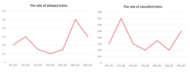 The two line graphs illustrate the weekly percentages of train delays and cancellations over a seven-week period from early October to mid-November.