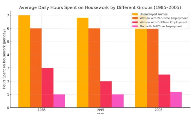 The bar chart compares the average daily hours devoted to household chores by four groups—unemployed women, women with part-time jobs, women working full-time, and men employed full-time—in three years: 1985, 1995, and 2005.