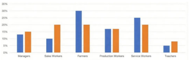 It is clear that three out of the six fields exhibited remarkable changes in the percentage of female workers. Although farming remained the leading sector for female employment, its proportion dropped significantly from 30% in 2007 to 20% in 2009. The figure for female service workers saw a less drastic fall to 20% during the same period, a decrease of 5%. In contrast, the percentage of female sales employees saw a twofold increase, reaching 20% in 2009.