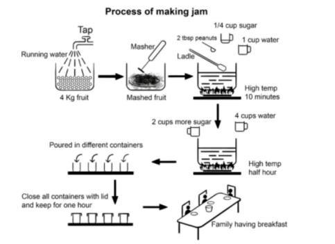 The diagram shows how to make jam from the fruit. Summarise the information by selecting and reporting the main features, and make comparison where relevant.