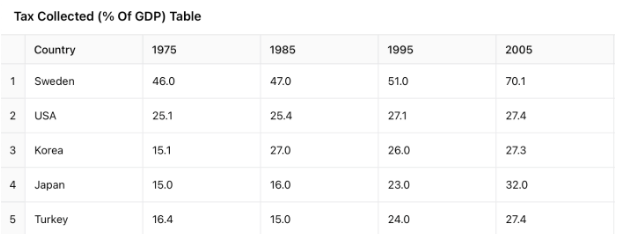 The table below gives information about the amount of tax collected (as % of GDP) in five
