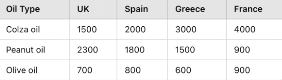 - France的colza oil产量最高(4000 tonnes), Greece排第二(3000 tonnes),Spain排第三(2000 tonnes)