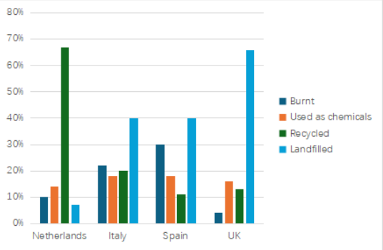 - 浅蓝色(landfilling):Italy、Spain、Britain中landfilling数据都最高(UK→65%,Italy、Spain→40%);Netherlands数据仅为8%