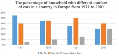 The bar chart illustrates changes in the number of cars per household in Europe between 1971 and 2001.