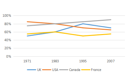 1-1971年UK和France大约50%,随后在1983年上升到60%