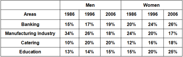 The table below shows the percentage of men and women working in four areas in 1986, 1996 and 2006.