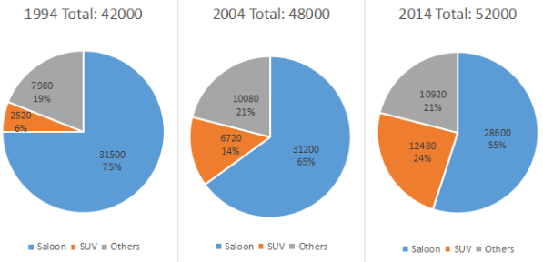 Most notably, there was a downward trend in the figure for saloon sales, whose proportion declined by 20% in 2014, with the figure plunging by nearly 3000. Despite the steep declines, it is also noticeable that the sales of saloons held the lion’s share throughout the period.