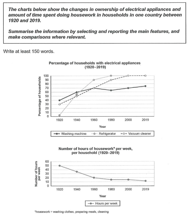 Depicted in the line graphs are the changing percentages of electrical appliances owned in one country and the weekly time allotted to deal with housework, including washing clothes, preparing meals and cleaning. The period of 1920 to 2019 is investigated.