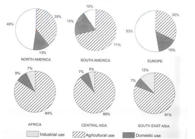 The charts below show the percentage of water used for different purposes in six areas of the world.