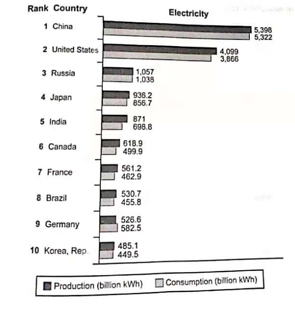 The bar chart below shows the top ten countries for the production and consumption of electricity in 2014.