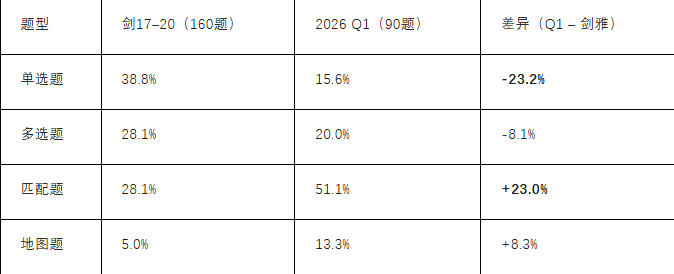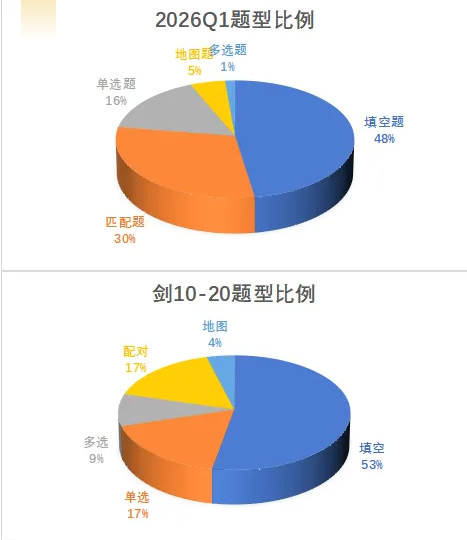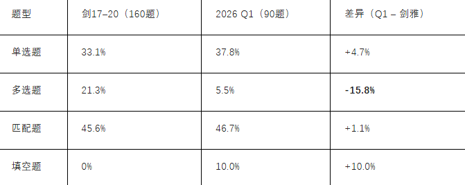 多选题从剑雅真题中平均9.1% 的占比骤降至1.4%,在2026年季度仅有一场考试出现,几乎可以忽略不计。备考中应大幅降低多选题的训练优先级。