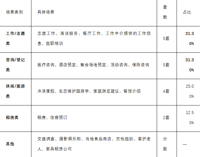 第三,休闲/旅游类场景在Q1中几乎缺失。 剑雅中此类占比25%,而Q1中仅有“活动咨询”勉强相关,占比明显偏低。