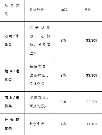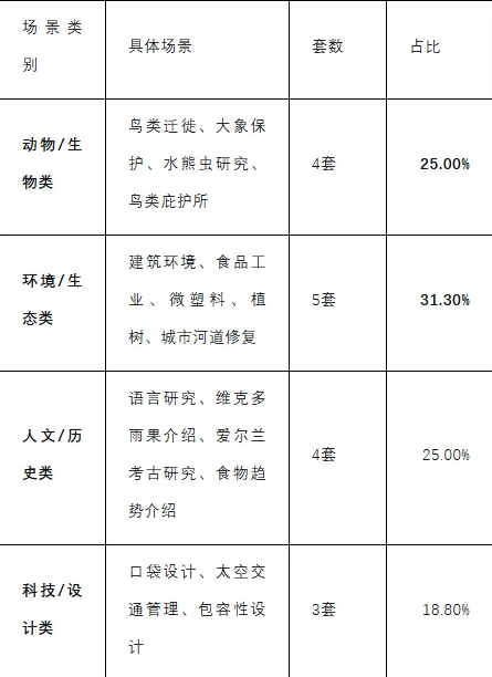第二,环境/生态类是剑雅频场景(31.3%),但在Q1中占比较低。 Q1中仅有“城市农业”可勉强归入生态类,占比不足12%,而剑雅中此类话题(微塑料、植树、河道修复等)占比接近三分之一。