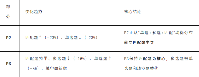 总体而言,无论是P2还是P3,匹配题都是当前考试中最重要、最稳定的题型。P2中匹配题占比已超过一半,P3中匹配题占比接近一半。单选题在P2中大幅减少,在P3中略有增加。多选题在P2和P3中均明显下降,尤其是在P3中几乎消失。填空题虽在P3中罕见出现,但仍属例外而非规律。备考时应将匹配题作为P2和P3的训练重点。