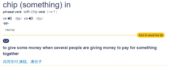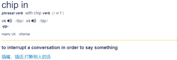 在英式英语中,chip in 也表示插嘴。在美式英语中chip in 通常表示:凑份子,出钱出力,这一表达源于赌博术语:chip即赌博游戏中的筹码