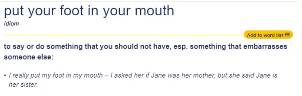众所周知,在生活中的不同场合中,我们的一言一行都必须要符合时宜。不过,我们难免会在一些场合下说错话或是办错事,可能每个人都或多或少有过这种经历吧。话从口出,今天就来说说mouth这个词。首先,我们都知道mouth是嘴巴的意思,那么老外常说的“I put my foot in my mouth”是什么意思呢?是“把脚放进嘴里”?这么恶心吗?