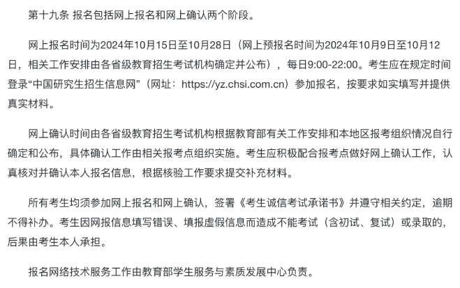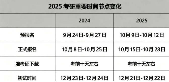 2025 年考研,报名启动时间延后,预报名从以往 9 月 24 日左右推迟至 10 月 9 日至 10 月 12 日,正式报名在 10 月 15 日开始,时长缩短至 14 天。但网上确认时间却未同步调整,致使 “报名开启” 到 “网上确认” 间隔成历年最短。