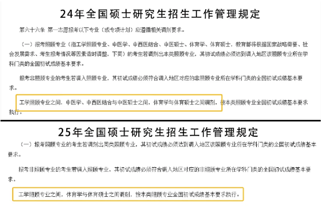 在 2024 年全国硕士研究生招生工作管理规定里,针对调剂有着明确要求,其中规定工学照顾专业之间,中医学、中西医结合与中医硕士之间,体育学与体育硕士之间进行调剂时,需按本类照顾专业全国初试成绩基本要求执行。这一规则在当时为相关专业调剂提供了统一标准。