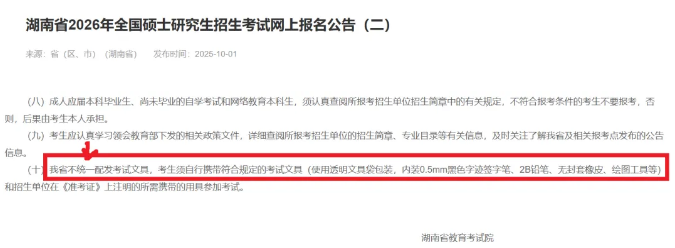 湖南省2026研考规定,湖南省今年不统一配发考试文具,考生须自行携带符合规定的考试文具(使用透明文具袋包装,内装0.5mm黑色字迹签字笔、2B铅笔、无封套橡皮、绘图工具等)和招生单位在《准考证》上注明的所需携带的用具参加考试。