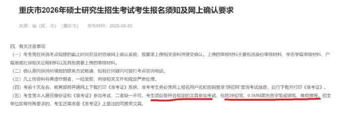 重庆2026研考要求,考生须自备符合规定的文具参加考试,包括2B铅笔、0.5MM黑色签字笔或钢笔、橡皮擦等。招生单位如有特殊要求的,考生还需准备《准考证》上备注的可携带文具。