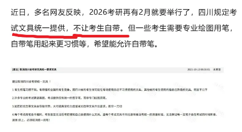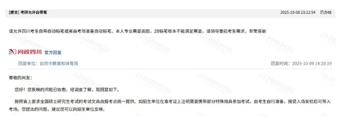 对于网友的相关建议,10月9日,自贡教体局也做了回复:按照省上要求全国硕士研究生考试的考试文具由报考点统一提供。如招生单位在准考证上注明需要携带部分特殊用具参加考试,由考生自行准备,接受入场安检后可带入考场。您提出的问题,建议您可以向招生单位反映。