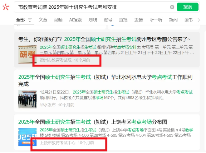 同学们也可以在微信里面搜索自己报考点“某某教育考试院2025年硕士研究生招生考试考场安排”关键词,可以参考往年考场安排,看是否有规律: