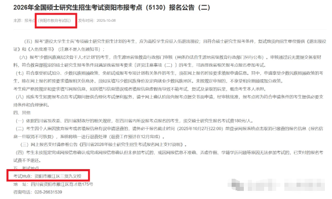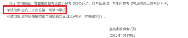 考试地点:宜宾三江新区第一高级中学校。(特别提醒:宜宾市教育考试院为报考点办公地点,非考试地点,考生所在考点考场信息以准考证为准。)