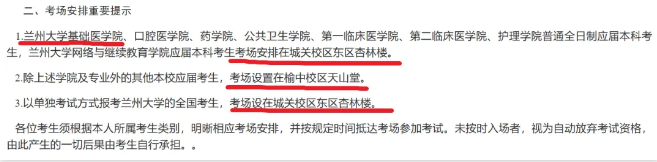 1.兰州大学基础医学院、口腔医学院、药学院、公共卫生学院、第一临床医学院、第二临床医学院、护理学院普通全日制应届本科考生,兰州大学网络与继续教育学院应届本科考生考场安排在城关校区东区杏林楼。