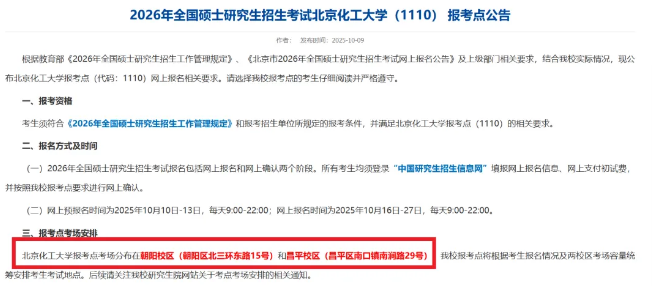 北京化工大学报考点考场分布在朝阳校区(朝阳区北三环东路15号)和昌平校区(昌平区南口镇南涧路29号)