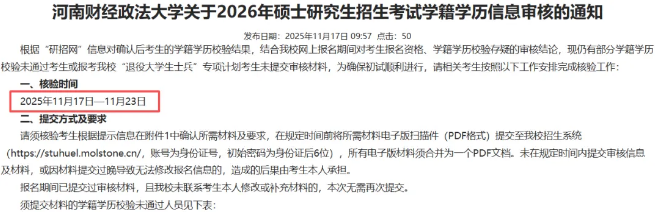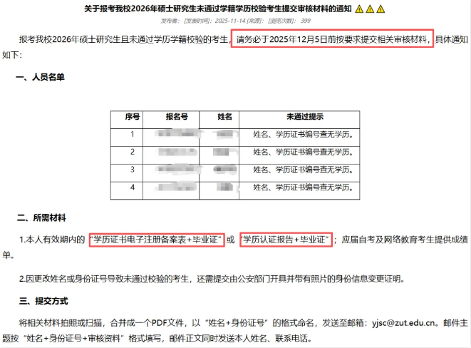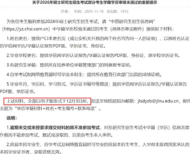 报考该校研究生未通过学历学籍校验的考生,应于2025年12月5日之前按要求提交相关审核材料。