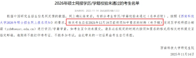 学籍学历校验未通过的考生应于12月3日之前将材料以电子版的形式发送至该校研招办邮箱。