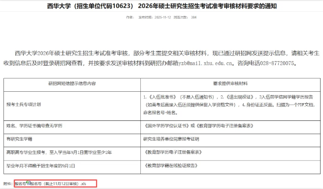 相关考生应于2025年12月18日之前将须知中要求的材料(电子稿)发送至学校研招办邮箱。