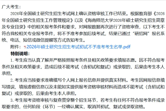 网上确认资格审核工作结束后,海南师范大学公布了报考学生中不符合报考条件的名单。