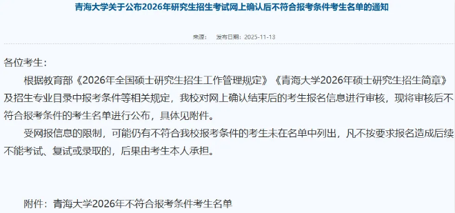 青海大学公布了网上确认结束后审核不符合报考条件的考生名单。