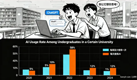 The cartoon vividly depicts that a sophomore is consulting ChatGPT to finish his thesis while his roommate reminds him “Don’t forget to think!” Needless to say, the flashing screen is a telling symbol of AI dependence. The bar chart above, entitled “AI Usage Rate Among Undergraduates in a Certain University”, records the real-world data behind the picture. From 2020 to 2024, the proportion relying on AI weekly surged from 5% to 58%, while daily users witnessed a ten-fold jump. Clearly, an increasing number of students have tended to outsource thinking to algorithms.