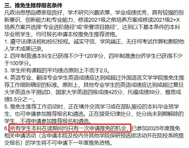 以复旦大学管理学院为例,其明确规定学生在本科在读期间仅享有一次推免申请机会,已参与本年度推免相关申请活动的学生,不得再次申请下一学年的推免资格。该学院的政策条款制定尤为细致,其中所指的“推免相关申请活动”不仅涵盖校内推免资格的正式申报,还包括参与校内外各类推免预选拔活动(如夏令营、预推核等)。这意味着,若学生在本年度已参加夏令营或预推免但未获得理想offer,试图放弃本次保研资格并计划来年重新参与推免,将不符合该校的政策要求。