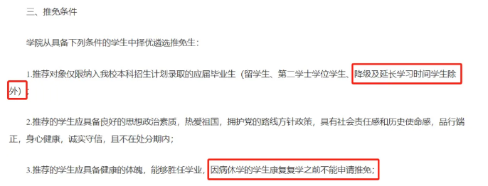 西安电子科技大学经管学院则是对休学和延毕学生进行了严格区分:“降级及延长学习时间的学生”,不在推荐对象之列;而针对“因病休学”的同学,学院指出在康复复学之前不能申请,这或许意味着,在同学恢复健康复学后,同样还是可以继续参与推免的。前文也提到,休学有很多原因,此处仅提到了“因病休学”,因此是否其他类型的休学能享受同样的待遇,就要进一步咨询学校教务处了。