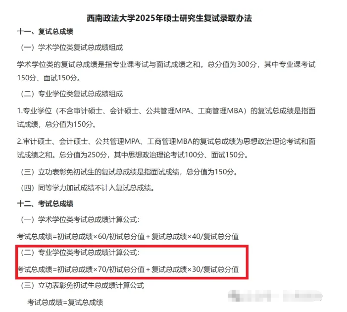 在上述计算公式中,复试成绩为所有复试科目成绩总和(不含同等学力考生加试成绩);初试加分的相关政策以《2025年全国硕士研究生招生工作管理规定》相关内容为准。