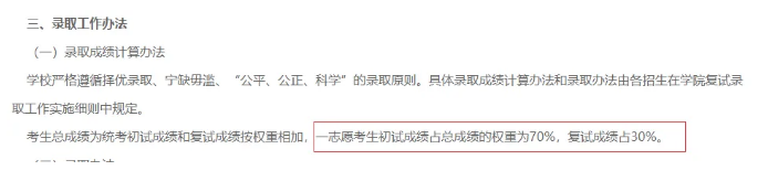 考生总成绩为统考初试成绩和复试成绩按权重相加,一志愿考生初试成绩占总成绩的权重为70%,复试成绩占30%。