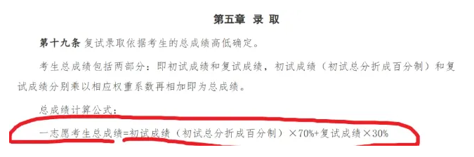 总成绩=初试成绩(初试总分折成百分制)×70%+复试成绩×30%