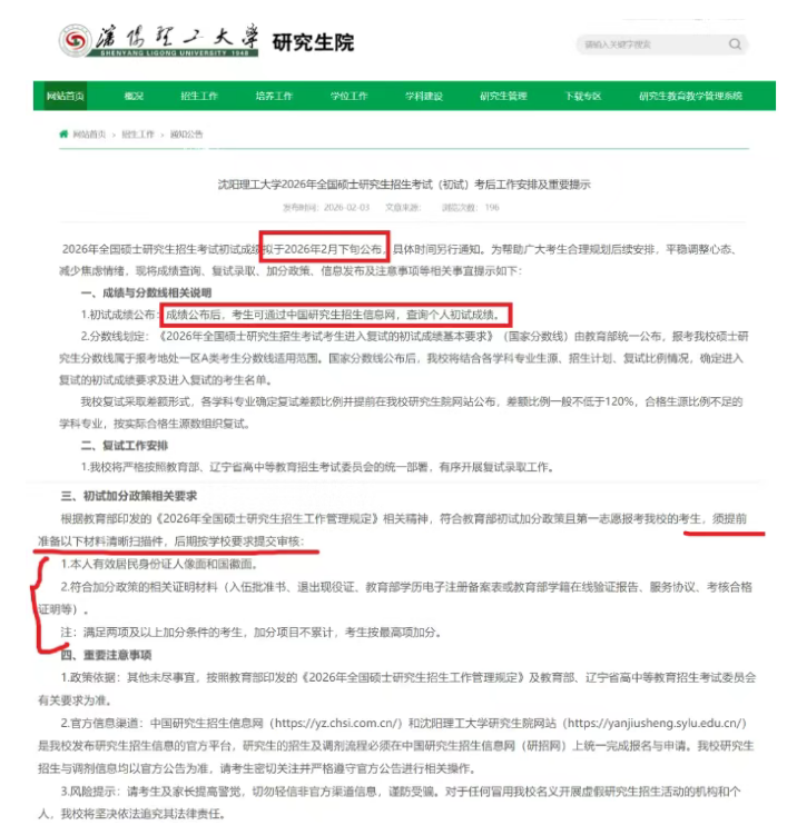 2月3日,沈阳理工大学最新发布,2026年全国硕士研究生招生考试(初试)考后工作安排及重要提示:2026年全国硕士研究生招生考试初试成绩拟于2026年2月下旬公布,具体时间另行通知。