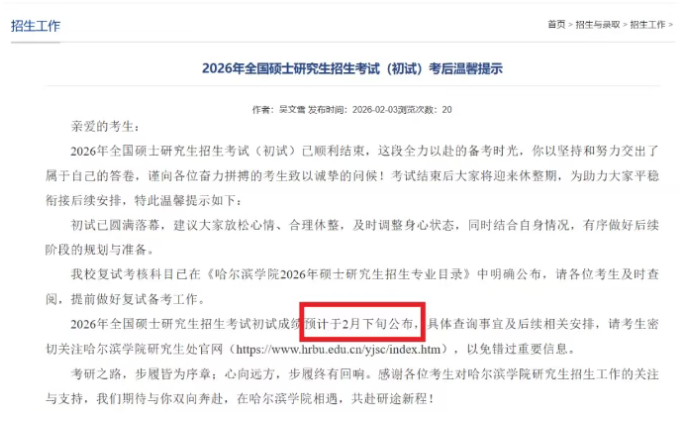 2月3日,哈尔滨学院发布最新公告,2026年全国硕士研究生招生考试(初试)考后温馨提示,2026年全国硕士研究生招生考试初试成绩预计于2月下旬公布,具体查询事宜及后续相关安排,请考生密切关注哈尔滨学院研究生处官网(https://www.hrbu.edu.cn/yjsc/index.htm),以免错过重要信息。