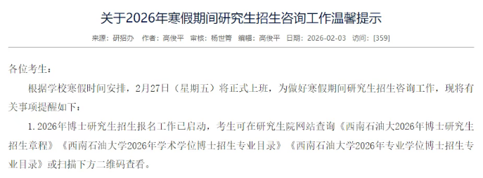 西南石油大学2月3日最新发布“关于2026年寒假期间研究生招生咨询工作温馨提示”,其中提到了2026年硕士研究生招生考试初试成绩预计2月下旬公布,考生可在研究生院网站查询所报考专业的复试专业课和同等学力加试科目或扫描下方二维码查看。
