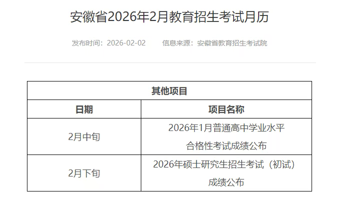 综上,结合近期安徽省教育考试院最新发布的考试月历,2月下旬,2026研考初试成绩公布,基本确定年后出成绩了。
