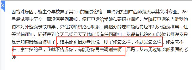 这也是个由来已久的话题了:广西师范大学是广西壮族自治区的一所比较普通师范类学校,往年这种调剂丑闻的事件就时有发生,但学校貌似也并不在意这件事对学校的影响,所以这所学校一直是调剂的禁区。
